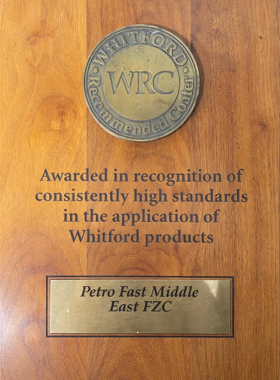 Petrofast Middle East FZC recognized as a Whitford WRC (Recommended Coater) consistently maintains high standards in the application of Whitford coating products. This certification highlights the company’s technical expertise and adherence to international coating standards.